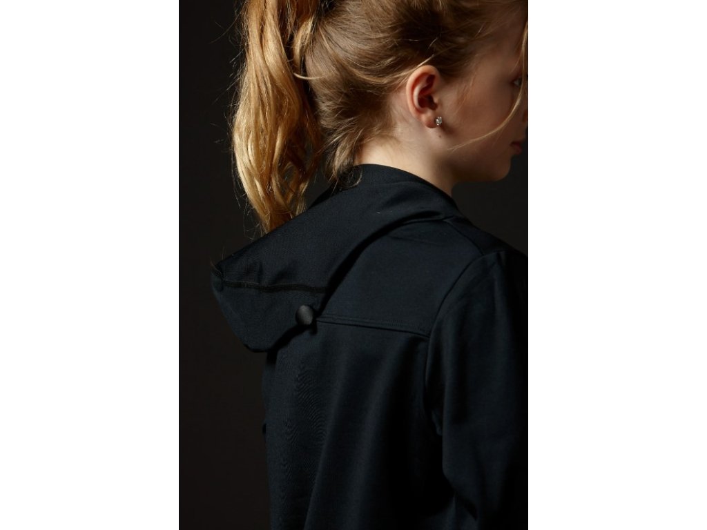 Černá mikina s kapucí z materiálu Fetex od značky Elite Xpression. Mikina je zdobená třpytivým nápisem Xpression. Kapuci lze zapnout na zádech tak, aby při bruslení nepřekážela.