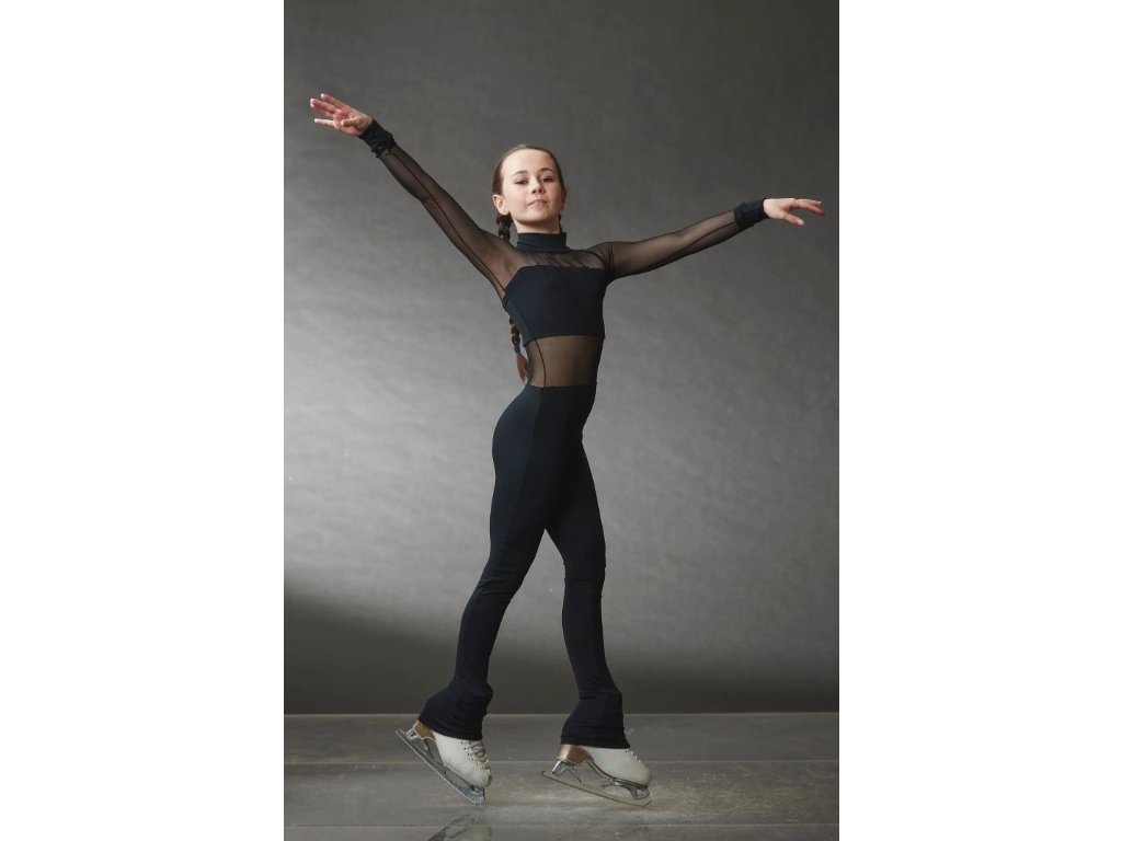 Jednodílný černý overal s černými síťovanými dlouhými rukávy a síťovaným břichem pro krasobruslení nebo tanec od kanadské značky Elite Xpression
