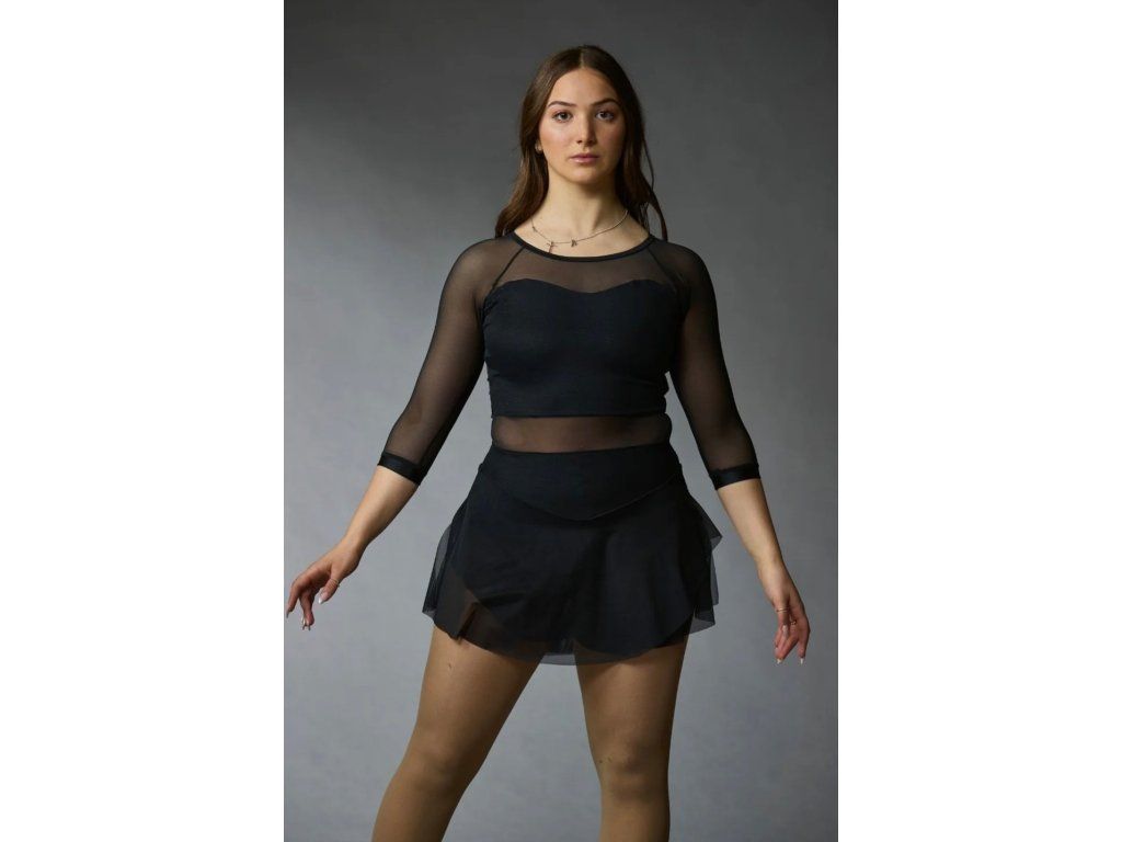 Jednoduché černé krasobruslařské šaty ze síťoviny s tříčtvrtečními rukávy a dvouvrstvou síťovanou sukní. Otevřená záda se síťovanou vsadkou na živůtku. Z kolekce Elite Xpression.