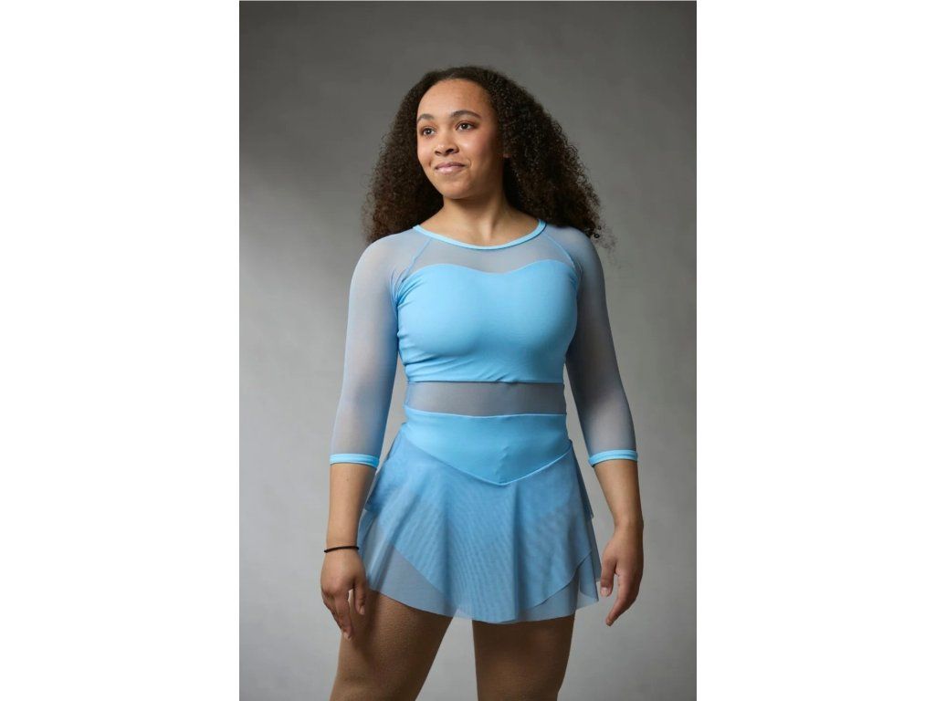 Jednoduché světle modré krasobruslařské šaty ze síťoviny s tříčtvrtečními rukávy a dvouvrstvou síťovanou sukní. Křížená ramínka zdůrazňují otevřená záda a síťovanou vsadku na živůtku. Z kolekce Elite Xpression.